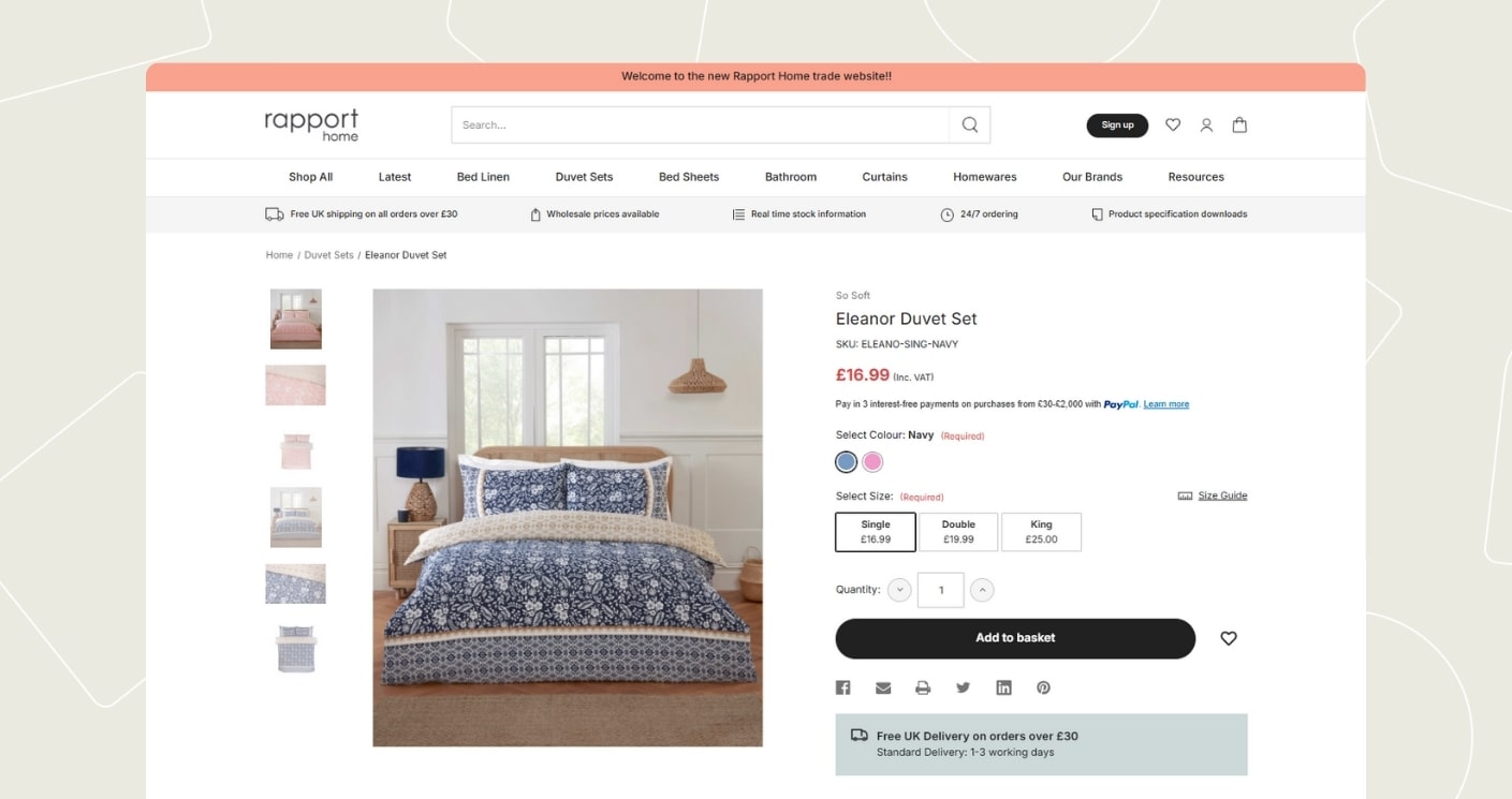 Studioworx were tasked with creating an online gateway to an existing business that has historically traded in B2B bulk ordering. Rapport Home wanted a B2B website that had a mix of B2C features too, allowing purchase functions to be more automated and less reliant on manual purchase ordering.